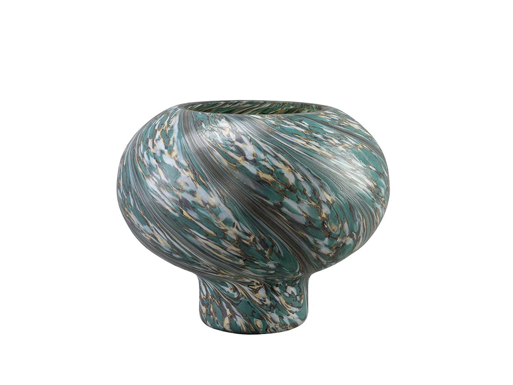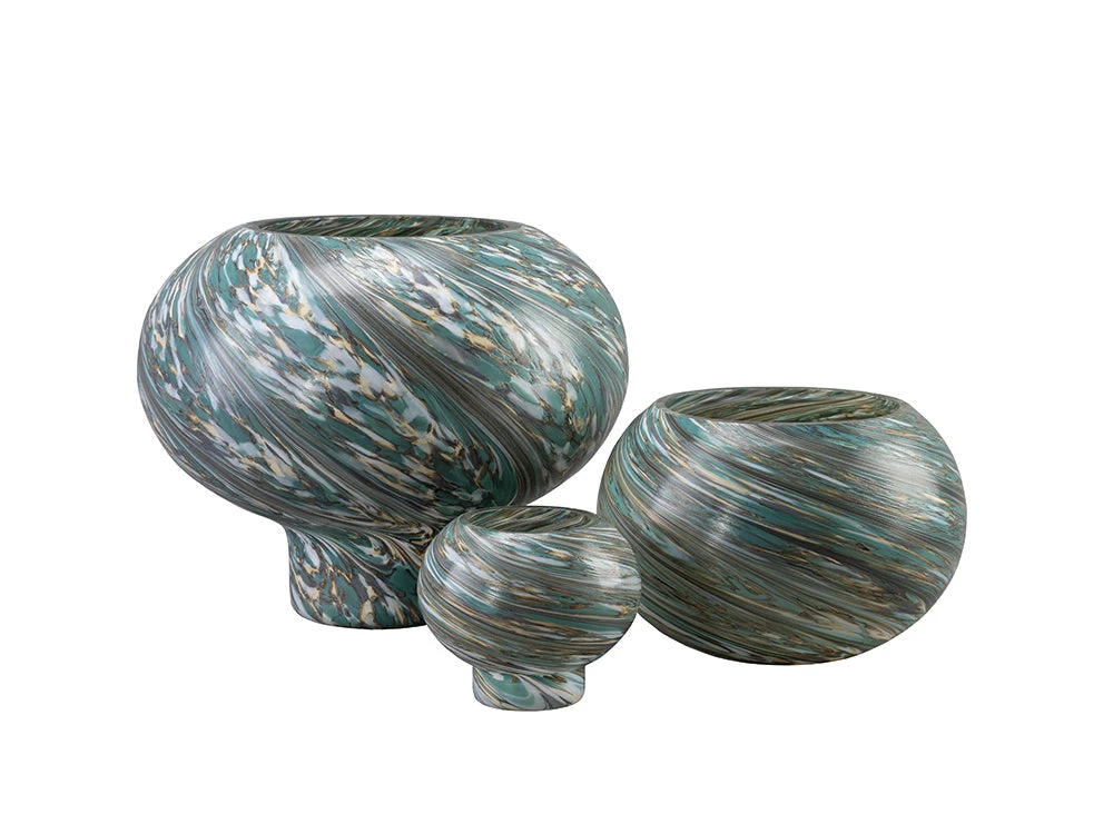 The design of Algae Vases draws inspiration from exotic marble pattern, the bold swirling design, mix of green, yellow, white, and black with some yellow accents provides a statement glass piece in the living or dining room. Use alone or pair with the other size for matching display.