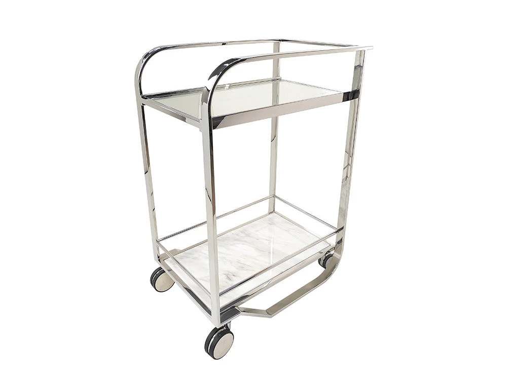 The Tracks Bar Trolley in silver stainless steel, features a glass top shelf and marble bottom shelf, perfect for all your Entertainment needs.