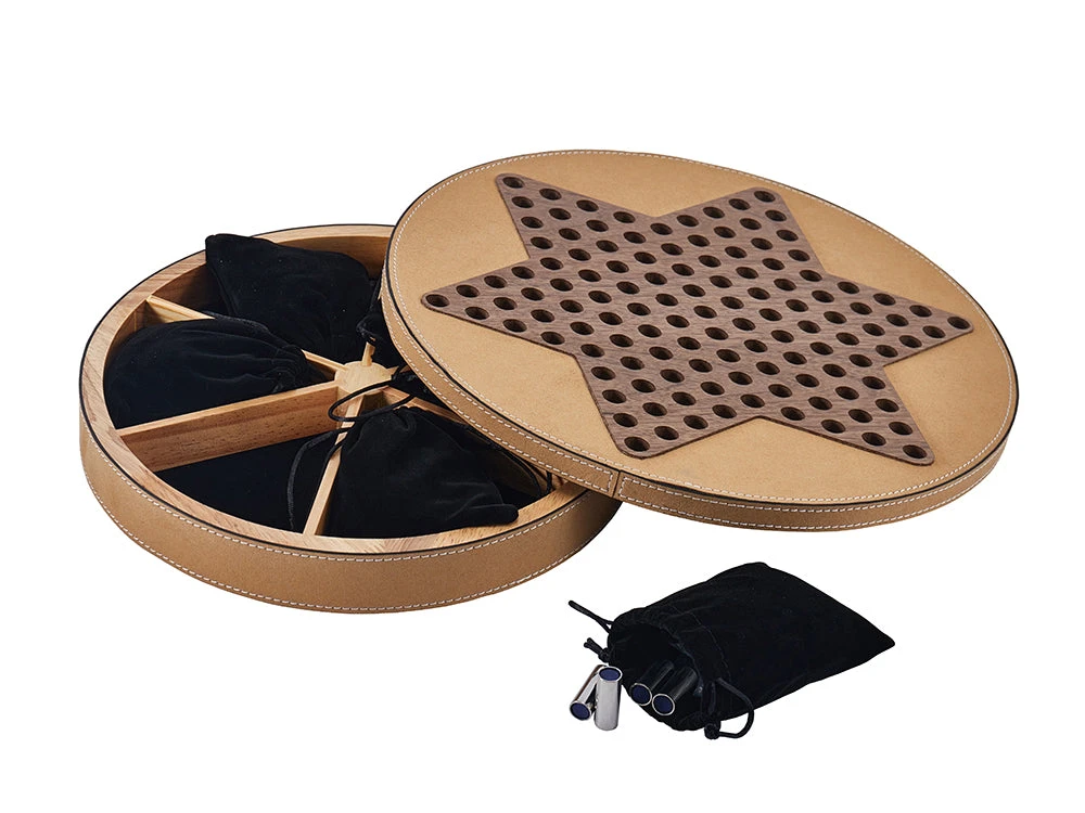 Our Graham Chinese Checkers set redefines sophistication in gaming. Its cleverly designed board allows seamless storage of game pieces underneath when not in play, ensuring convenience and organization. Complete with luxurious velvet pouches for elegant packing of the pieces, this set transforms a classic pastime into a refined experience. Perfect for enhancing leisure with timeless charm and practicality.
