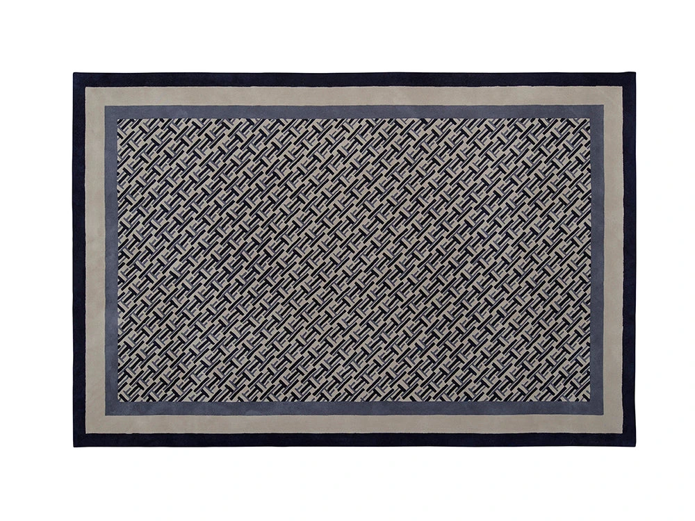 The Indigo Living designed Hudson Rug features contemporary take on a more traditional patterned rug. Bound by a navy blue border, the main field of the rug contains a blue and white interlocking pattern. Made from a 100% International wool blend, it will ensure a quiet and serene living space by reducing echo. This subtle contemporary rug was designed with a variety of interiors in mind. Cut pile construction. Available in two sizes.
