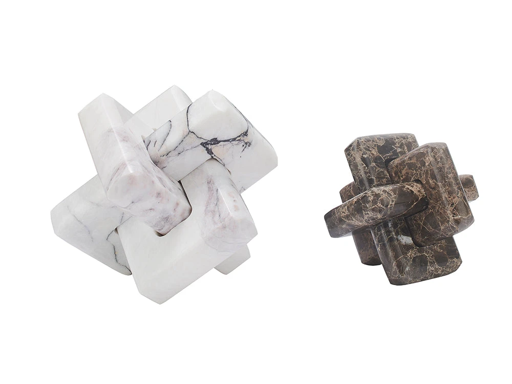 This marble sculpture will be a talking point in your home. Carved entirely out of white marble, three interlocking pieces come together to form a knot shape. Place on a coffee table by itself or pair it with the smaller knot ornament in a rich brown marble.