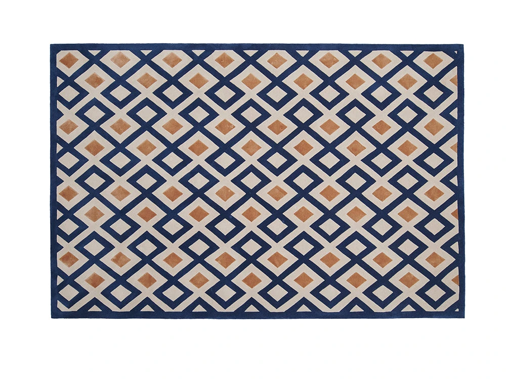 The Montel Rug features a Moroccan inspired tile floor design set with Navy Blue in Wool and Gold in Cotton Boarder. The use of polished cotton in the design give the elevate the design with light reflection.