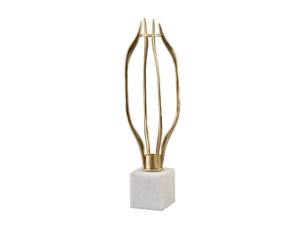 This Sculptural candle holder features Gold details entangled a taper candle atop a white marble base. This statement design offers surprises on a variety of interiors. Create a modern, dynamic table scape by pairing this with the lower version. Taper candles sold separately.