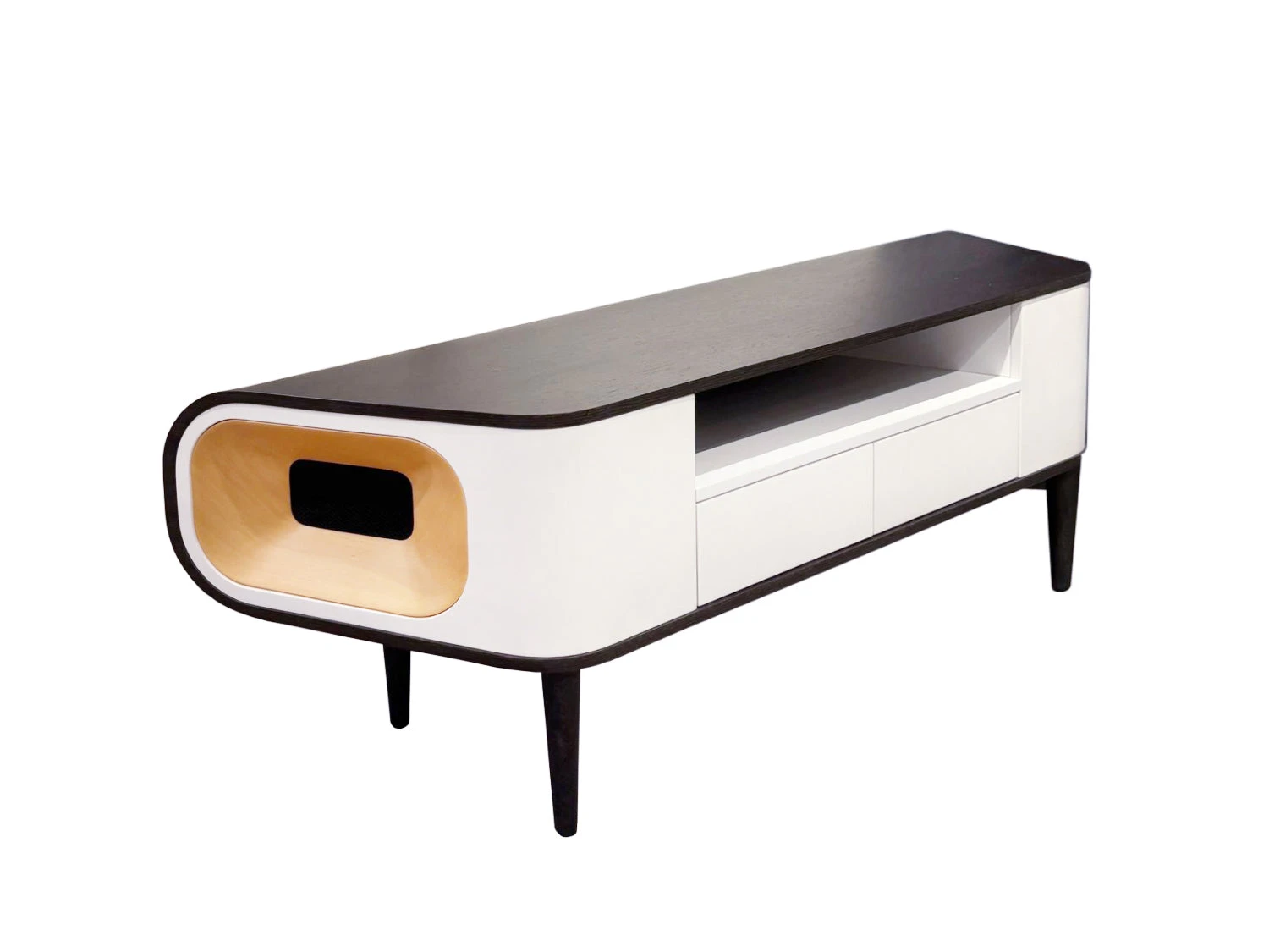 SoundRIPPLE, means the waves and ripples of sound, is a brand that pursues prefect acoustics and provides high-quality artistic audio furniture. This TV Cabinet consists of ample storage space, with 2 open shelves storage and 2 drawers.